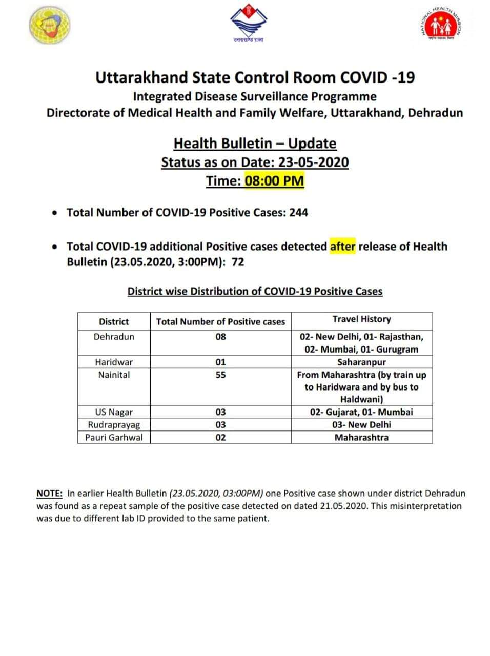 वहीं 3 बजे और रात 8 बजे के हेल्थ बुलेटिन में  नैनीताल-55 देहरादून-8 हरिद्वार-1 उधमसिंहनगर-3 पिथौरागढ़-3 पौड़ी-2 कोरोना वायरस के मामले सामने आए  जिससे प्रदेश में कुल कोरोना वायरस मरीजों की संख्या 244 हो गई है